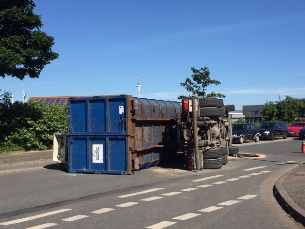 Ein Muldenkipper LKW war bei einem Abbiegevorgang aus ungeklärter Ursache umgekippt. Der Fahrer wurde verletzt in seinem Fahrzeug eingeschlossen. Die Feuerwehr rettete die Person aus dem Fahrzeug und übergab sie anschließend dem Rettungsdienst zur weiteren Behandlung. Der Fahrer wurde anschließend in das Klinikum transportiert. Die Feuerwehr stellte den Brandschutz an der Einsatzstelle sicher und fing auslaufende Betriebsstoffe aus dem umgekippten Fahrzeug auf. Der Einsatz war nach ca. 3 Stunden beendet.