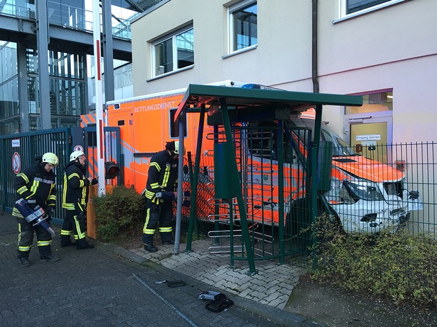 Die Feuer- und Rettungsleitstelle erhielt um 8:22 Uhr die Information, dass ein Rettungswagen ein massives Tor zu einem nahegelegenen Firmengelände durchbrochen habe und seine Fahrt auf dem Gelände fortsetze. An einem weiteren Tor wurde der Rettungswagen beim Versuch dieses ebenfalls zu durchbrechen aufgehalten und kam zwischen dem Tor und einer Hauswand zum Stehen. Das Fahrzeug war eingekeilt und konnte durch den Fahrer nicht mehr bewegt werden. Ein Austeigen war für ihn unmöglich. Augenscheinlich erlitt der Fahrer hierbei keine Verletzungen.