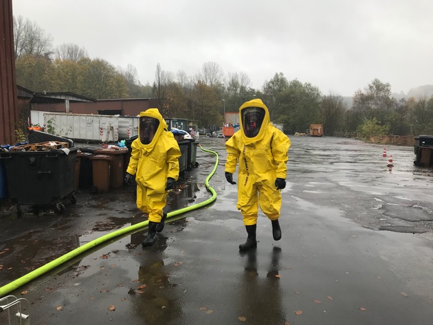 Um den Einsatzkräften einen bestmöglichen Schutz zu gewähren, wurde der Container mit Chemikalienschutzanzügen erkundet. Bei Einsatz von Chemikalienschutzanzügen ist eine umfangreiche Dekontamination der Einsatzkräfte erforderlich, die durch die nachgerückten Einsatzkräfte sichergestellt wurde.
