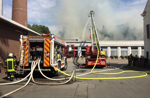 Hohe Außentemperaturen erforderten massiven Personaleinsatz Die Feuerwehr Dorsten wurde am heutigen Dienstag gegen 09:40 Uhr zu einem Brand einer Lagerhalle alarmiert, die der Lagerung von Teppichen und Messeständen diente. Noch während des Eintreffens der ersten Einsatzkräfte, kam es zu einer Durchzündung eines Teilbereiches des 180 x 60 m großen Komplexes. Da Menschen weder gefährdet noch verletzt wurden, konnten sich die eingesetzten Kräfte umgehend um den Schutz der übrigen Gebäudeteile und der angrenzenden Gebäude kümmern. Mit einem massiven Wassereinsatz über zwei Drehleitern mit Wenderohren und der Vornahme einiger C-Rohre, konnte ein Übergriff der Flammen erfolgreich verhindert werden. Da die physische Belastung der vorgehenden Frauen und Männer aufgrund der hohen Außentemperaturen extrem hoch war, wurde ein sehr hoher Kräfteansatz notwendig. Die Bekämpfung des eigentlichen Brandes gestaltete sich sehr schwierig, da das Feuer auf die Dachkonstruktion übergriff und ein öffnen des Daches notwendig machte. Die Brandbekämpfung in diesem Bereich wurde anschließend durch die geschaffene Öffnung möglich und so konnte ein ablöschen der Glutnester erfolgen.