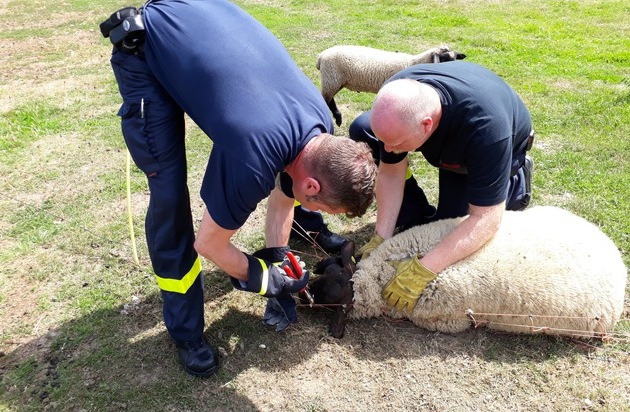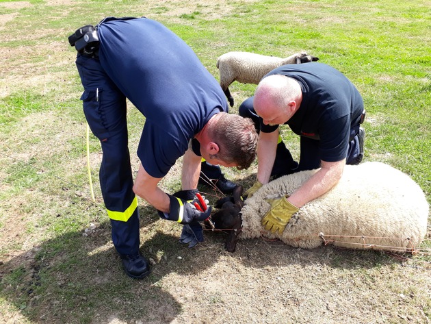 Um 12:32 Uhr wurde die hauptamtliche Wache wiederrum mit dem Einsatzstichwort "Kleintier in Notlage" zur Bestener Straße alarmiert. Hier war ein Schaf in der Sonne und Temperaturen über 30 Grad vermutlich schon seit Stunden in mit den Vorderbeinen und dem Kopf in einer Zaunanlage eingeklemmt. Der Angriffstrupp des Hilfeleistungslöschfahrzeuges konnte das erschöpfte Tier mit einem Seitenschneider aus dem Zaun befreien. Es war allerdings augenscheinlich unverletzt und konnte der Herde gleich wieder folgen.