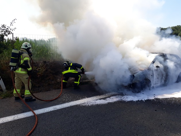 Am gestrigen Nachmittag wurde die Feuerwehr Dorsten zu einem PKW Brand auf der Hervester Straße in Fahrtrichtung Gelsenkirchen alarmiert. Bei Eintreffen des Hilfeleistungslöschfahrzeuges der hauptamtlichen Wache stand der PKW bereits in Vollbrand. Nach eigenen Angaben konnten die vier Fahrzeuginsassen, zwei Erwachsene und zwei Kinder, das Fahrzeug in letzter Minute verlassen. Der Brand hatte zudem bei leichtem Wind auf den Seitenstreifen übergegriffen.
