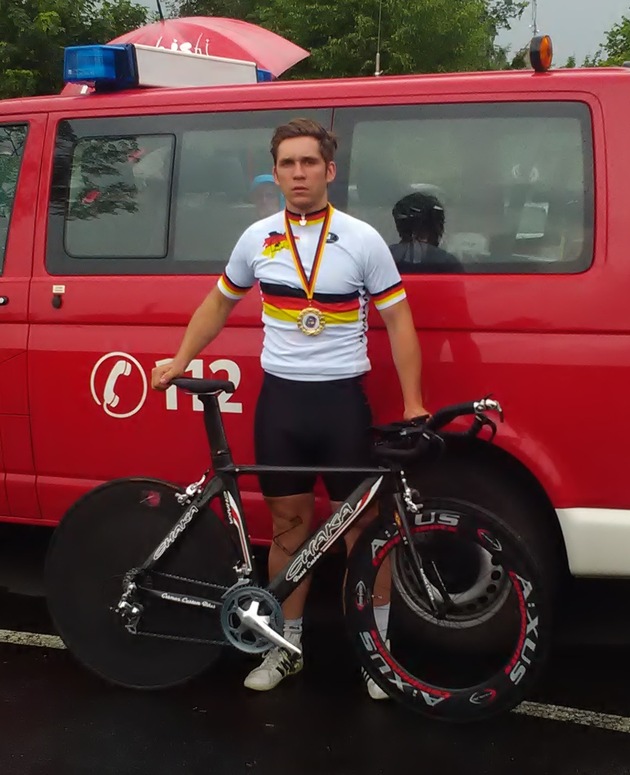Marius Prünte, hauptamtlicher Mitarbeiter der Feuerwehr Erkrath holte sich am vergangenen Sonntag den Deutschen Feuerwehrmeistertitel im Zeitfahren für die Feuerwehr Erkrath in Göttingen-Ronsdorf. Die Deutsche Meisterschaft ging über 25 km welligen Kurs und das Starterfeld war von Feuerwehrmännern aus der ganzen Bundesrepublik besetzt. Marius Prünte machte sich mit der Startnummer 199 als drittletzter auf die Strecke. Leider fing es direkt nach dem Start heftig an zu regnen und zu stürmen, sodass Marius Prünte sich kaum vorstellen konnte um den Sieg zu fahren, da seine stärksten Konkurrenten vorher im strahlenden Sonnenschein fahren konnten. Nach den ersten 10 km stellte er aber fest, dass die Beine gut sind und dass das Tempo auch stimmte. Er gab alles, musste sich aber immer wieder darauf konzentrieren um auf dem nassen Kurs nicht wegzurutschen. Nach 36 Minuten und 55 Sekunden erreichte er das Ziel und konnte sich somit den Sieg und damit den Deutschen Feuerwehrmeistertitel bei den Männern unter 30 Jahren sichern.
