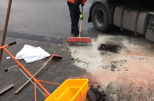 Durch die Kreisleitstelle wurde die Feuerwehr Erkrath am Dienstagmorgen zu einem Kraftstoffauslauf auf dem Parkplatz eines Raiffeisenmarktes in Unterfeldhaus alarmiert. Dort wurde bei einem Rangiervorgang die Kraftstoffleitung eines Lkw beschädigt. Da sich das Fahrzeug unmittelbar an einem Kanaleinlauf befand, drohte der auslaufende Kraftstoff in die Kanalisation zu gelangen. Durch das schnelle und beherzte Eingreifen von Mitarbeitern des Raiffeisenmarktes, die umgehend einen Wall aus Katzenstreu und einer Kunststoffplane um den Kanaleinlauf errichteten, konnte der Kraftstoffeinlauf in die Kanalisation erfolgreich verhindert werden. Die kontaminierte Fläche wurde von den Einsatzkräften nach der Bergung des Lkw abgestreut und das mit Kraftstoff kontaminierte Bindemittel aufgenommen und der Entsorgung zugeführt. Der Einsatz der Feuerwehr Erkrath, die mit drei Fahrzeugen und sieben Einsatzkräften vor Ort war, konnte nach ca. 70 Minuten beendet werden.