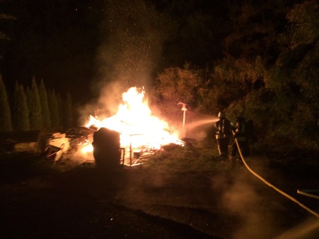 Zu einem gemeldeten Waldbrand an der Johannesberger Straße wurde die hauptamtliche Wache und der Löschzug Millrath in der Nacht zu Sonntag alarmiert. Schon auf der Anfahrt konnte im Bereich der angegebenen Einsatzstelle heller Feuerschein festgestellt werden. Vor Ort stellte sich aber schnell heraus, dass auf dem Gelände einer Gartenbaufirma eine ca. 4 x 4 Meter große Gartenhütte in Vollbrand stand.