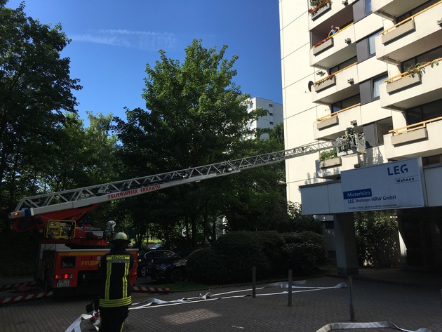 Vollalarm löste die Kreisleitstelle Mettmann heute Vormittag um 09:58 Uhr für die Freiwillige Feuerwehr Erkrath sowie für die Einsatzkräfte der hauptamtlichen Wache aus. Der Hausmeister eines Hochhauses am Stadtweiher hatte den Alarm von ausgelösten Rauchmeldern gehört und im 2. Obergeschoß des Gebäudes Brandgeruch festgestellt. Daraufhin alarmierte er umgehend die Feuerwehr.
