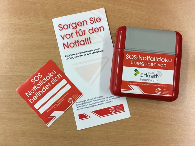 Der Arbeitskreis Rettungsdienst des Kreisfeuerwehrverbandes Mettmann konnte nach einigen Monaten der Abstimmung und Entwicklung im Einvernehmen mit dem Kreis Mettmann als Träger des Rettungsdienstes eine Notfallbox sowie einen einheitlichen Info-Flyer entwickeln, die bereits ab September 2017 im Kreis Mettmann verteilt werden.