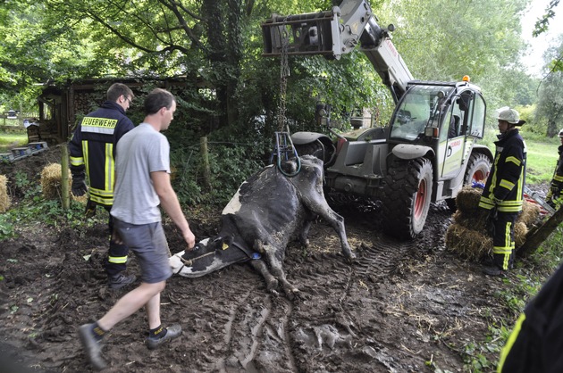 Der Tierhalter konnte sie alleine nicht wieder befreien und rief über den Notruf 112 die Feuerwehr. Die Kuh drohte immer tiefer in den schlammigen Graben zu versinken.