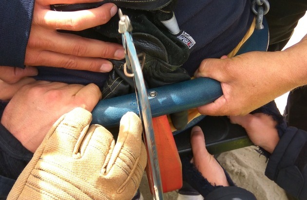 Die Einsatzkräfte zersägten behutsam und vorsichtig den Korb der Schaukel und hoben das Mädchen schließlich einfach heraus. Nach wenigen Augenblicken war das Mädchen unverletzt aus seiner misslichen Lage befreit. Sie wurde vor Ort um Rettungsdienst betreut.