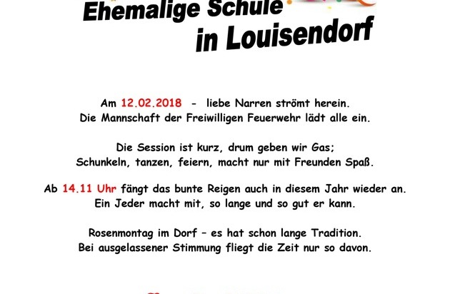 Die Wehrmänner und - frauen freuen sich auf zahlreiche närrische Gäste, denn für gute Stimmung und beste Bewirtung ist gesorgt. Tanzen, feiern, fröhlich sein in Louisendorf bleibt keiner lange allein. Daher: Wer bisher Rosenmontag noch nichts vor hatte, sollte sich unbedingt den Termin vormerken und vorbeischauen.