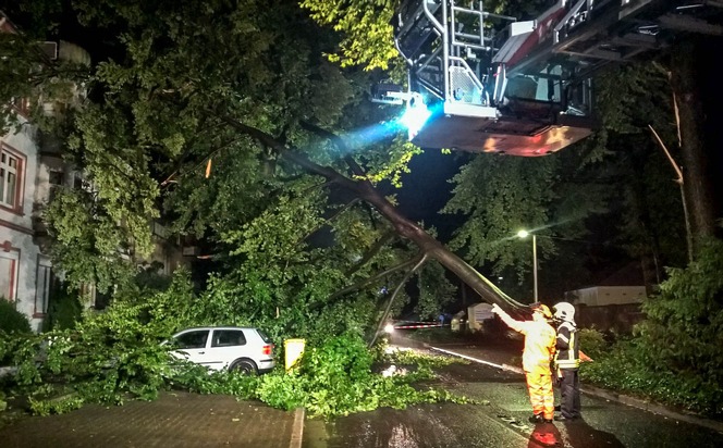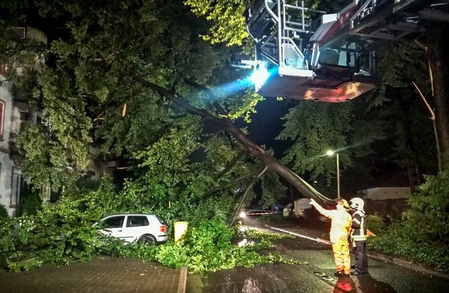 Gleich dreimal musste die Feuerwehr Gelsenkirchen in der Nacht auf Dienstag ausrücken, um umgestürzte Bäume zu beseitigen. Der größte Baum stürzte an der Buer-Gladbecker-Straße gegen ein Haus und drei PKW. Verletzt wurde glücklicherweise niemand. Der erste umgestürzte Baum wurde der Leitstelle um 21.36 Uhr gemeldet. Dieser blockierte eine Fahrbahnhälfte der Ostpreußenstraße. Mit einer Motorsäge wurde der Baum schnell vom Löschzug Horst der Freiwilligen Feuerwehr zerlegt. Deutlich aufwendiger gestaltete sich der zweite Einsatz an der Buer-Gladbecker-Straße. Hier war ein etwa 1 Meter dicker und 20 Meter hoher Stamm abgebrochen. Der Stamm und das Geäst hing in einem weiteren Baum und lehnte zudem gegen eine Hauswand eines Mehrfamilienhauses. Auch drei Fahrzeuge waren von den Ästen getroffen worden. Zwei Fahrzeuge konnten von den Einsatzkräften weggefahren werden, anschließend wurde der Stamm mit einer Winde und Stahlseilen vom Haus weggezogen. Mit drei Motorsägen wurde der Baum anschließend zersägt. Neben den drei PKW wurde auch das Haus leicht beschädigt. Erst um 1.40 Uhr konnte der Einsatz beendet werden. Etwa eine halbe Stunde später, um 02.12 Uhr wurde der Leitstelle die dritte Einsatzstelle gemeldet. Erneut war ein 20 Meter hoher Baum mit einem Stammdurchmesser von über einem Meter umgestürzt, dieses Mal an der Straße "Im Emscherbruch". Der Baum lag quer über die gesamte Fahrbahn, hatte aber glücklicherweise weder Fahrzeuge noch Gebäude getroffen. Mit zwei Motorsägen wurde auch dieser Baum beseitigt. Hier dauerten die Arbeiten bis 04.20 Uhr.
