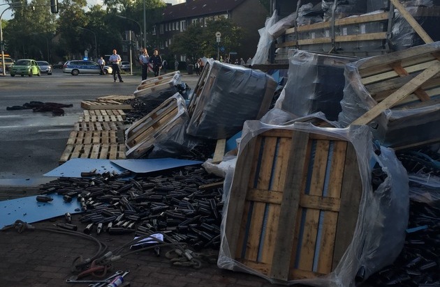Am Montag, 14. September 2015 um 15:10 Uhr, verunfallte in Gelsenkirchen Heßler ein LKW mit seinem Sattel Auflieger beim Abbiegen von der Grothusstraße auf die Uferstraße.