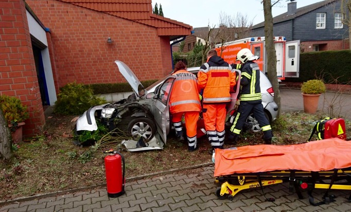 Der zweite Unfall ereignete sich um 15.32 Uhr im Wendehammer einer verkehrsberuhigten Straße in Erle. Im Ihmenkampsweg verunfallte eine ältere Dame aus bisher ungeklärter Ursache beim Ausparken ihres Fahrzeuges. Dabei prallte sie zunächst mit der Front ihres Wagens gegen die Wand einer Garage und kam dann im Vorgarten eines Hauses zum Stehen. Die Fahrertür des PKW wurde durch den Aufprall so stark verformt, dass erst Einsatzkräfte der Feuerwehr die Tür zu der Dame aufbrechen konnten. Anschließend wurde die Frau schonend aus ihrem Wagen gerettet und in ein Krankenhaus transportiert.
