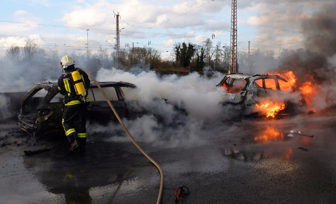 Um 18.26 Uhr erreichte der erste Notruf die Leitstelle der Feuerwehr Gelsenkirchen und meldete einen Verkehrsunfall auf der A 42 in Fahrtrichtung Dortmund zwischen den Anschlussstellen GE-Schalke und GE-Bismarck. Laut des Anrufers solle ein Fahrzeug brennen, über Verletzte konnte er zunächst keine Angaben machen. Aufgrund der unklaren Lage entsendete die Leitstelle zwei Löschfahrzeuge sowie Einheiten des Rettungsdienstes auf die Autobahn. Schon auf der Anfahrt war für die Einsatzkräfte eine hohe schwarze Rauchwolke sichtbar. Aufgrund des bereits großen Rückstaus verzögerte sich das Eintreffen der Rettungsfahrzeuge, da diese zum Teil nur in Schritttempo in Richtung der Unfallstelle fahren konnten. Vor Ort zeigte sich den Einsatzkräften dann folgendes Bild: Auf der linken Fahrspur waren fünf PKW aufeinander geprallt. Personen befanden sich glücklicherweise nicht mehr in den Fahrzeugen, aber alle fünf Wagen brannten in voller Ausdehnung. Am Fahrbahnrand standen mehrere verletzte Personen, die sofort vom Rettungsdienst untersucht und versorgt wurden. Insgesamt wurden bei dem Unfall neun Personen verletzt, zwei von ihnen schwer. Alle wurden zur weiteren Behandlung in Krankenhäuser transportiert. Parallel zur Verletztenversorgung begannen die Kräfte der Feuerwehr mit zwei Strahlrohren die brennenden Fahrzeuge zu löschen. Um dafür ausreichend Löschwasser zur Verfügung zu haben, wurde ein Abrollbehälter mit 8.000 Litern Löschwasser zur Einsatzstelle gebracht. Nach etwa 20 Minuten war der Brand unter Kontrolle, letzte Brandnester wurden mit Löschschaum erstickt. Aufgrund der Rettungs- und Löscharbeiten musste die A 42 in Fahrtrichtung Dortmund komplett gesperrt werden und auch die Fahrtrichtung Oberhausen war kurzzeitig, aufgrund der starken Rauchentwicklung gesperrt. Die Aufräum- und Nachlöscharbeiten der Feuerwehr zogen sich noch bis 21.30 hin. Zur Unfallursache hat die Polizei die Ermittlungen aufgenommen. Bei dem Großeinsatz von Feuerwehr und Rettungsdienst waren insgesamt 35 Einsatzkräfte mit 6 Löschfahrzeugen, 6 Rettungswagen und einem Notarzt vor Ort. Die Berufsfeuerwehr wurde dabei von den Löschzügen Erle-Nord und Buer-Mitte der Freiwilligen Feuerwehr unterstützt.