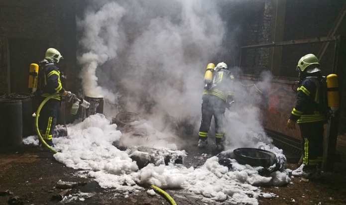 Brennende Altreifen und Unrat in einer leerstehenden Lagerhalle waren der Grund für einen Feuerwehreinsatz am Samstagnachmittag. Verletzt wurde bei dem Feuer niemand. Um 15.30 Uhr erreichten mehrere Anrufe über Notruf 112 die Leitstelle der Feuerwehr, die eine Rauchentwicklung aus einer Lagerhalle am Nordring in Buer meldeten. Beim Eintreffen der ersten Einsatzkräfte der Feuerwache in Hassel bestätigte sich diese Meldung. Aus der ungenutzten Halle, die ehemals einem Stahlbetrieb gehörte, drang dichter schwarzer Brandrauch. Um an den Brandherd zu gelangen, brachen die Einsatzkräfte die Halle auf und gingen dann ausgerüstet mit Atemschutzgeräten und einem Strahlrohr in die Halle vor. Nach kurzer Suche war der Brandort gefunden: Auf einer Fläche von ca. 40 Quadratmetern brannten Altreifen und Unrat. Mit einem Schaumrohr konnten die Flammen schnell abgelöscht werden. Anschließend wurde die Halle belüftet. Nach gut eineinhalb Stunden konnte der Einsatz beendet werden. Insgesamt waren 26 Einsatzkräfte vor Ort, wobei die Berufsfeuerwehr durch den Löschzug Buer-Mitte der Freiwilligen Feuerwehr unterstützt wurde.