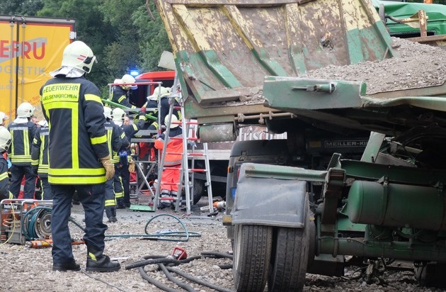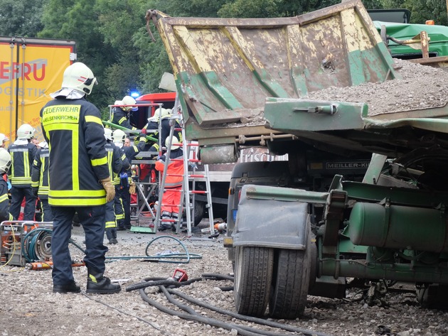 Um 11:00 Uhr kam es heute in Gelsenkirchen zu einem schweren Verkehrsunfall mit vier LKW auf der Autobahn 42 kurz hinter der Auffahrt Bismarck in Fahrtrichtung Oberhausen. Dabei wurden drei LKW-Fahrer schwer verletzt und in ihren Fahrzeugen eingeklemmt. Die Feuerwehr setzte ihr hydraulisches Rettungsgerät ein, um die Fahrer aus ihren stark deformierten und teilweise in sich verkeilten Fahrzeugen zu befreit. Durch die schwere des Unfalls gestaltete sich die Befreiung allerdings schwierig. Während den Arbeiten an den Fahrzeugen, wurden die drei Verletzten durch Notärzte medizinisch versorgt und im Anschluss an ihre Rettung zur weiteren Behandlung mit Rettungswagen in Gelsenkirchener Krankenhäuser gebracht. Insgesamt waren sechsundvierzig Einsatzkräfte an dem Einsatz beteiligt. Unterstützt wurden die Feuerwehr Gelsenkirchen durch den Rettungshubschrauber Christoph 9 aus Duisburg, einem Notarzt und RTW aus Herne und dem Feuerwehrkran aus Bochum, der allerdings nicht zum Einsatz kam. Während des gesamten Einsatzes war die A42 gesperrt. Die Unfallursache wird durch die Polizei ermittelt.