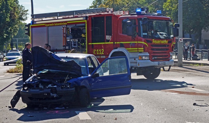 Bei einem Verkehrsunfall auf der Kurt-Schumacher-Straße Ecke Schernerweg sind am Sonntagmittag vier Personen verletzt worden, eine davon schwer. Um kurz nach 13.30 Uhr ereignete sich der Unfall zwischen zwei PKW im Kreuzungsbereich der Kurt-Schumacher-Straße in Fahrtrichtung Buer und dem Schernerweg. Durch den Zusammenprall wurde ein Fahrzeug ins Gleisbett der Straßenbahn geschleudert und die Insassen der beiden Fahrzeuge, jeweils ein Mann und eine Frau, verletzt. Während drei Personen nur leichte Verletzungen davon trugen, wurde die Fahrerin eines PKW schwer verletzt und musste nach einer ersten Behandlung durch einen Notarzt vor Ort in ein nahegelegenes Krankenhaus transportiert werden. Auch die drei anderen Personen wurden durch den Rettungsdienst versorgt und in Krankenhäuser transportiert. Durch Einsatzkräfte der Feuerwache Buer wurden Betriebsmittel der Fahrzeuge abgestreut und die Batterien abgeklemmt. Insgesamt waren drei Rettungswagen, ein Notarzt sowie ein Löschfahrzeug vor Ort.