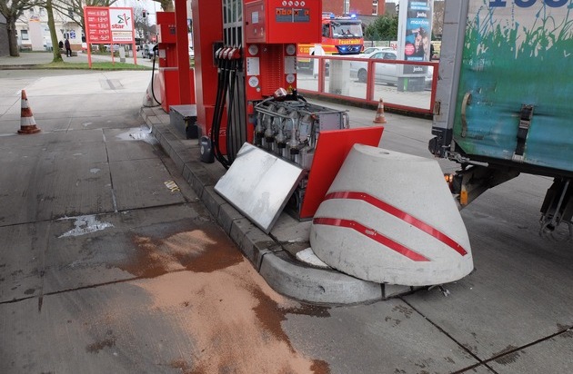 FW-GE: Doppeltes Glück im Unglück LKW mit Anhänger demoliert Zapfsäule, brennbarer Treibstoff tritt aus.