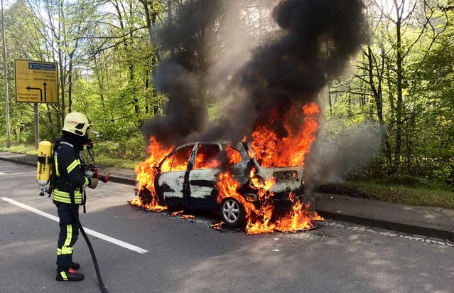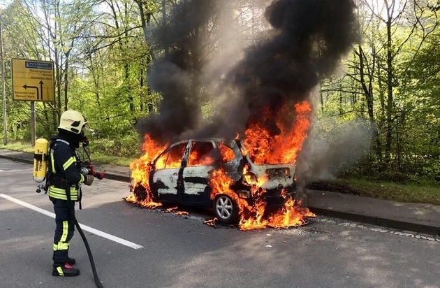 Am heutigen Dienstag wurde die Feuerwehr um 9.30 Uhr in die Resser Mark alarmiert. Auf der Münsterstraße war ein PKW in Brand geraten. Beim Eintreffen des Löschfahrzeuges der Feuerwache Buer brannte der Wagen in voller Ausdehnung. Brennender Kraftstoff lief bereits in einen Kanaleinlauf. Mit einem Strahlrohr konnte der Brand schnell gelöscht werden. Anschließend wurde das völlig ausgebrannte Auto sowie der Kanaleinlauf mit Schaum geflutet. Verletzt wurde glücklicherweise niemand.