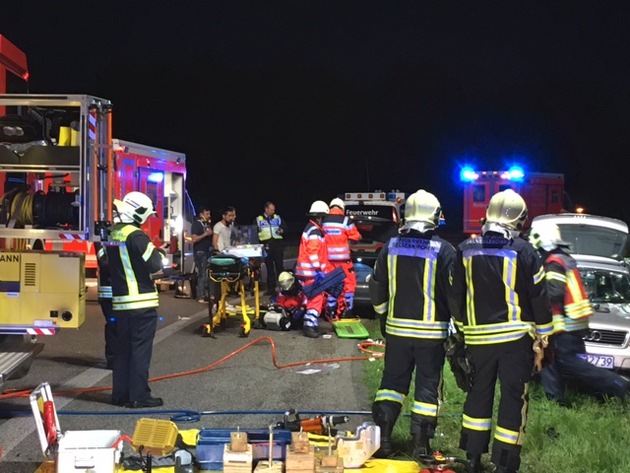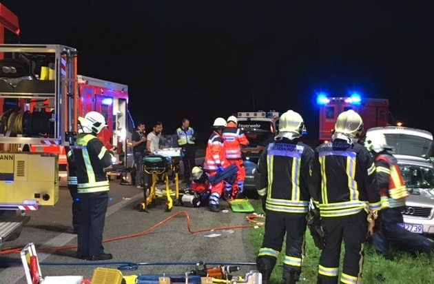 Bei einem schweren Verkehrsunfall in der Anschlussstelle Gelsenkirchen Zentrum der BAB 42 sind am Abend 5 Personen verletzt worden, 3 davon schwer. Eine Person wurde im Fahrzeug eingeklemmt. Gegen 21.10 Uhr ist Mercedes mit zwei Insassen (ein Mann, eine Frau) bei der Abfahrt von der BAB 42 von der Fahrbahn abgekommen, ca. 50 m über einen Grünstreifen gerutscht und mit einem Audi kollidiert. Die Insassen des Mercedes konnten sich selbst befreien. Im Audi wurde der Fahrer eingeklemmt, die Ehefrau und ein Kind konnten das Fahrzeug leichtverletzt verlassen. Der Ehemann wurde patientenorientiert mit hydraulischem Rettungsgerät aus dem Fahrzeug befreit. Hierzu musste das Dach des Audi-Avant entfernt werden. Während der gesamten Maßnahmen wurden die Verletzten von 4 Rettungswagenbesatzungen und einer Notärztin medizinisch versorgt. Alle Verletzten wurden in Gelsenkirchener Krankenhäuser transportiert. Insgesamt waren bei der Rettung 32 Einsatzkräfte eingebunden. An beiden Fahrzeugen entstand Totalschaden. Die Autobahn Zu-/ bzw. Abfahrt war während der Rettungsmaßnahmen gesperrt.