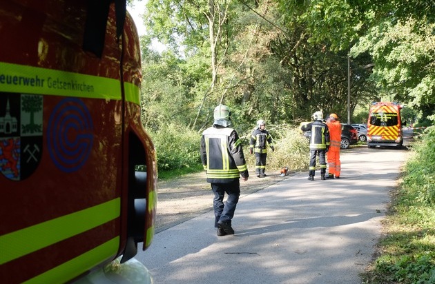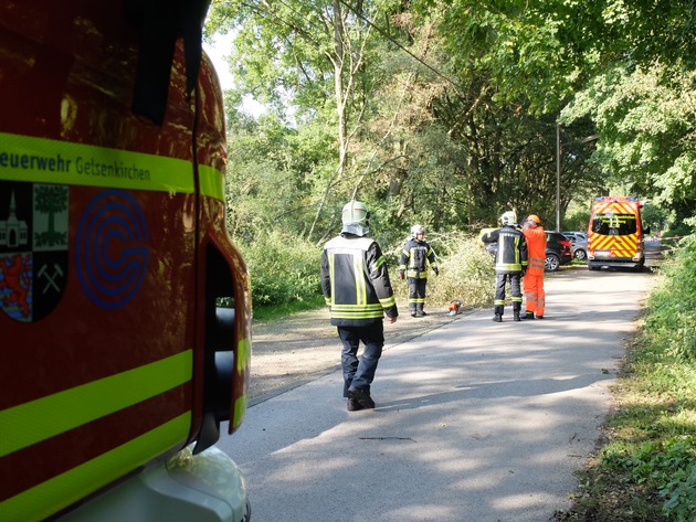 Am Sonntagvormittag wurde die Feuerwehrleitstelle über einen Baum auf einer Oberleitung in der Holzbachstraße informiert. Umgehend wurden Einheiten der Feuerwache Buer zur Einsatzstelle entsandt. Ein Baum lag quer über einem Telefonkabel und ein weiterer dicker Ast hing im Bereich der Oberleitung. Die Einsatzstelle wurde gesichert und mittels Drehleiter sowie einer Kettensäge der Baum und der Ast entfernt. Die Einsatzdauer betrug ca. 45 min.