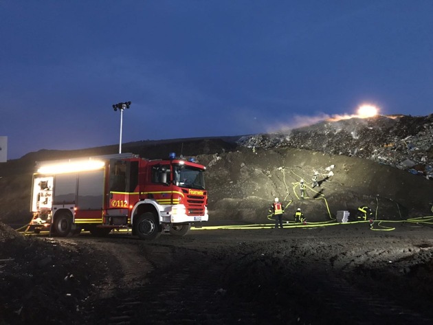 "Feuerschein und Rauchentwicklung auf der Zentraldeponie Gelsenkirchen", meldete die Leitstelle der Feuerwehr Herne den Gelsenkirchener Kollegen gegen 04:00 Uhr heute Morgen. Passanten hatten in Herne diesen Notruf abgesetzt, nachdem sie diese Beobachtung gemacht hatten. Weil sich die Deponie auf Gelsenkirchener Stadtgebiet befindet, wurden Einheiten der Wache Buer, Hassel und Altstadt in den Emscherbruch entsandt. Bereits auf der Anfahrt war der Feuerschein deutlich für die Einsatzkräfte sichtbar. Auf Grund der schwierigen Geländeverhältnisse und dem damit zu erwartenden Mehraufwand für die Löschwasserversorgung, wurde Gesamtalarm für die Freiwillige Feuerwehr Gelsenkirchen gegeben. Im oberen, südlichen Bereich der Deponie brannte Müll auf einer Fläche von rund 200 Quadratmetern. Mit mehreren Strahlrohren wurde die Brandbekämpfung eingeleitet und somit die Ausbreitung auf weitere Bereiche der Deponie verhindert. Mitarbeiter des Deponiebetreibers besetzten 2 Planierraupen und einen Kettenbagger und deckten die brennende Fläche zudem mit Erdreich ab. Die Nachlöscharbeiten zogen sich bis in die Mittagsstunden des Sonntag, wobei die Kräfte nach Einbruch des Tages deutlich reduziert werden konnten. Während der Einsatzdauer wurden die Wachen der Berufsfeuerwehr mit den Kräften der Freiwilligen Feuerwehr ergänzt. Erleichtert wurde die Erkundung des schwer zugänglichen Geländes durch den Einsatz des kamerabestückten Multikopters der Feuerwehr Gelsenkirchen, der der Einsatzleitung aussagekräftige Luftbilder liefern konnte.