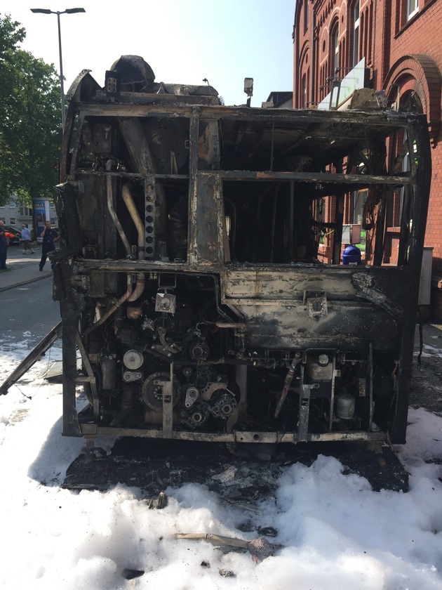 Die Feuerwehr Gelsenkirchen wurde heute gegen 09.36 Uhr zum Brand eines Linienbusses der Bogestra (Linie 381) in die Steeler Straße nach Rotthausen alarmiert. Bei Eintreffen der Einsatzkräfte hatten sich die zwölf Fahrgäste und der Fahrer des Buses bereits ins Freie gerettet. Die Einsatzkräfte löschten den Heckbereich des Fahrzeugs mit einem Schaumrohr, dass unter Atemschutzgeräten vorgenommen wurde. Zu Nachlöscharbeiten kam auch ein C-Rohr zum Einsatz. Der Brandrauch zog in ein benachbartes Gebäude, das von der Feuerwehr kontrolliert wurde. Die Anwohner wurden zur Sicherheit aus dem Gebäude geführt. Nach ca. 1 Stunde konnte der Einsatz beendet werden. Eingesetzt wurden 20 Einsatzkräfte der Wachen Altstadt, Heßler und Buer.