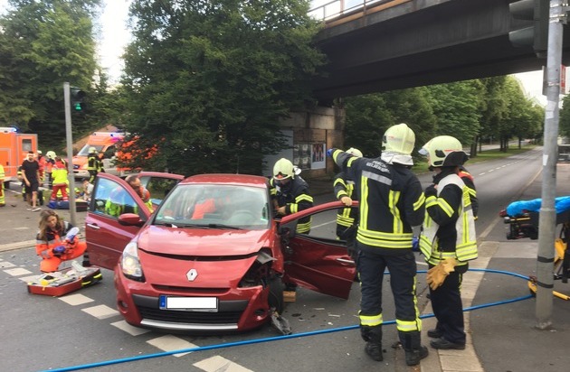 Am heutigen Samstag gegen 18.24 Uhr wurde die Feuerwehr Gelsenkirchen zu einem schweren Verkehrsunfall in die Kreuzung der Straßen "An der Rennbahn/Kranefeldstraße" gerufen. Dort waren zwei PKW mit insgesamt 6 Insassen, darunter zwei Kinder ( 6 und 8 Jahre alt), kollidiert. Alle Fahrzeuginsassen wurden verletzt und in Krankenhäuser transportiert. Ein 60 jährige Frau wurde in ihrem Renault Clio eingeklemmt und musste mit hydraulischen Rettungsgerät befreit werden. Zwei Löschzüge der Berufsfeuerwehr, 6 Rettungswagen und zwei Notärzte (insgesamt ca. 50 Einsatzkräfte ) kümmerten sich um die Versorgung der Verletzten. Der Sachschaden wird auf ca. 50.000 Euro geschätzt. Die genaue Unfallursache muss von der Polizei ermittelt werden.