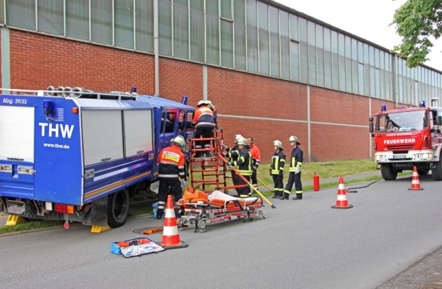 Die Übungslage sah vor, dass ein LKW-Fahrer auf der Straße "Hammerweide" die Gewalt über sein Fahrzeug verloren hatte und ungebremst gegen eine Hallenwand gefahren war. Fahrer und Beifahrer wurden dabei im Fahrerhaus eingeklemmt und waren bewusstlos. Durch die Wucht des Aufpralls war ein Teil der Hallenwand eingestürzt und hatte mehrere schwere Maschinenteile umgerissen. Drei Mitarbeiter wurden darunter begraben.