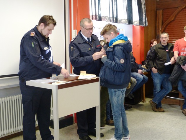 Auch im Jahr 2015 haben wieder mehrere Jugendfeuerwehrangehörige die Prüfungen zur Erlangung des Jugendfeuerwehrabzeichens "Jugendflamme" abgelegt. So konnte Tobias Jakob zehn Jugendfeuerwehrmitglieder mit der Jugendflamme der Stufe 1 auszeichnen, und acht Nachwuchs-Brandschützer erhielten das Abzeichen der Stufe 2.