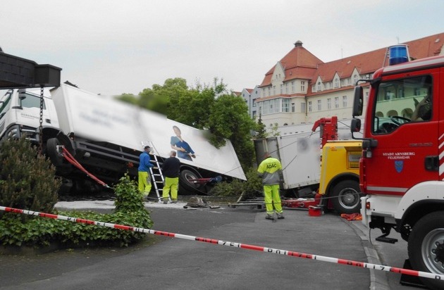 FW-AR: Fahrerloser LKW rollt in Arnsberg über Kreuzung und stürzt um