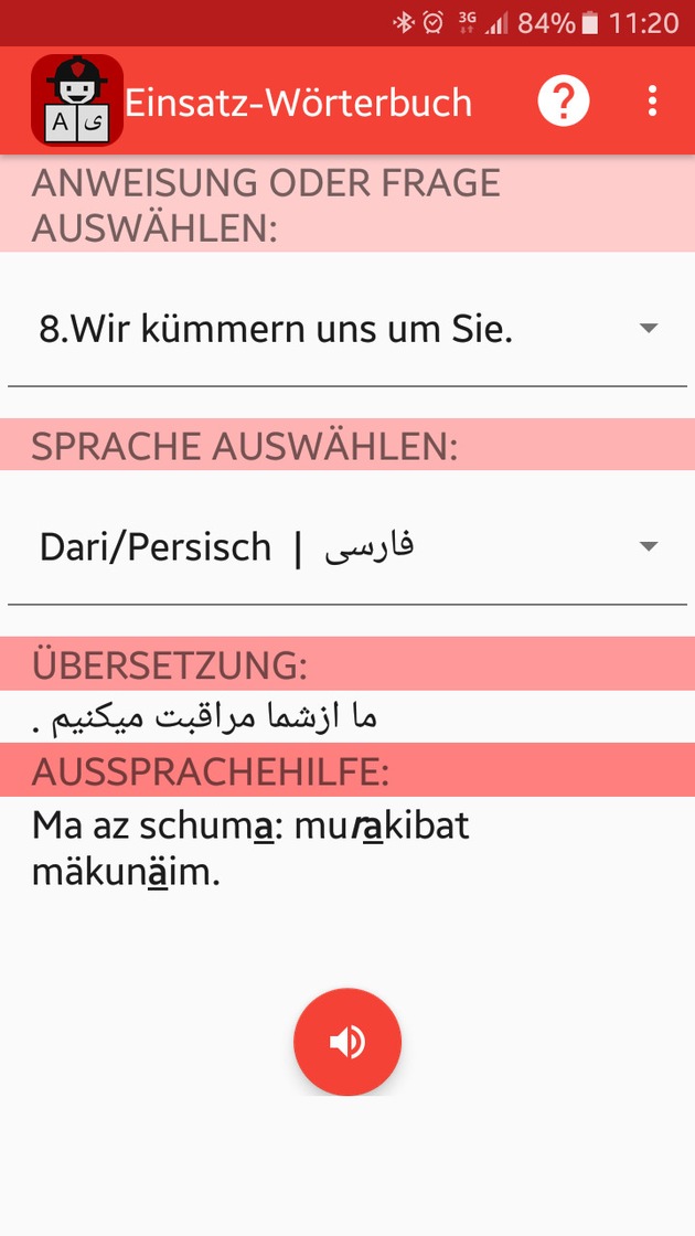 Und der große Erfolg der mehrsprachigen Einsatzhilfe hat die Arnsberger Feuerwehr zu einem neuen Projekt motiviert: Als Entwicklungsstufe wurde eine Smartphone-App programmiert, die die Inhalte des Einsatz-Wörterbuches in zeitgemäßer Form mit einer intuitiven Bedienbarkeit anbietet. Damit ergänzt die Arnsberger Feuerwehr das digitale Angebot der Ruhr-Stadt im Rahmen der Strategie "Digitale Stadt Arnsberg". Die App ist mit einer Sprachausgabe versehen, wodurch die übersetzten Texte, sofern es die Einsatzsituation zulässt, den betroffenen Personen direkt vorgespielt werden können. Auch hier engagierte sich das Fachsprachenzentrum der Universität Bielefeld maßgeblich. Fazel Rabi Nasry zeichnet für die App verantwortlich. Er erstellte die Konzeption, die Edition der Sprachaufnahmen, das Design und die Programmierungsarbeiten. Ohne sein sachkundiges Engagement gäbe es diese App nicht. Die Gewinner dieser hervorragenden Kooperation sind sicherlich diejenigen Menschen, denen das Wörterbuch oder die App im Notfall helfen können. Die Smartphone-App zum Einsatz-Wörterbuch ist für das Android-Betriebssystem verfügbar. Weitere Versionen dieser Anwendung für die Betriebssysteme iOS und Windows sollen wenn möglich später folgen. Die App kann unter dem folgenden Link von der Homepage der Feuerwehr Arnsberg heruntergeladen werden: http://feuerwehr-arnsberg.de/images/Nachrichten/App.apk Die Brandschützer aus Arnsberg freuen sich, mit ihrer Idee einen offenbar bestehenden Bedarf der Feuerwehren und der Hilfsorganisationen in Deutschland decken und mit ihrer Idee hilfebedürftigen Menschen in einer Notlage noch besser helfen zu können.