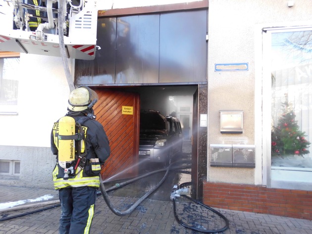 Arnsberg-Neheim. Am Neujahrsmorgen wurden Feuerwehr und Rettungsdienst gegen 10.40 Uhr zu einem Pkw-Brand an der Schulstraße in Neheim gerufen. Als die ersten Einsatzkräfte eintrafen, befand sich das in einer Garage zwischen den Wohngebäuden geparkte Fahrzeug bereits im Vollbrand, und das Feuer drohte auf ein angrenzendes Wohngebäude überzugreifen. Rund 90 Einsatzkräfte der Hauptwachen Neheim und Arnsberg sowie der Einheiten aus Neheim, Bachum und Voßwinkel waren vor Ort.