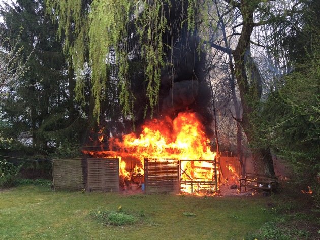 Beim Eintreffen des ersten Löschfahrzeugs brannte eine Gartenhütte und ein Holzstapel in voller Ausdehnung. Das Feuer hatte sich bereits auf einen angrenzenden Baumbestand ausgeweitet und es drohte der Übergriff der Flammen auf mehrere Garagen in unmittelbarer Nähe.