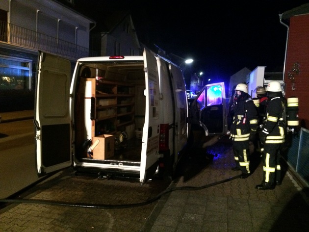 Als Amtshilfe für die Polizei wurden die Feuerwehrbeamten gegen 23 Uhr in die Straße "Bernhardshammer" gerufen. Noch während der Einsatzmaßnahmen vor Ort, erreichte die Feuerwehrwache ein Notruf über einen brennenden Kleintransporter in der Breiniger Stefanstraße. Hierzu wurden die Löschgruppe Breinig und das Hilfeleistungslöschfahrzeug der Feuerwache alarmiert. Mit einem C-Rohr unter Atemschutz löschten die Kräfte der Löschgruppe Breinig das Feuer auf der Ladefläche ab.