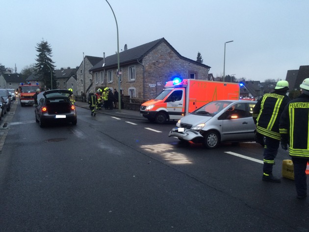 Zu einem Zusammenstoß zwischen zwei PKW kam es am Sonntagnachmittag gegen 16.49 Uhr an der Einmündung Wilhelm-Pitz-Straße und der Straße "Im Steg" im Ortsteil Breinig. Aufgrund der Notrufmeldungen rückte die Feuerwehr Stolberg mit dem Hilfeleistungslöschfahrzeug und dem Rettungswagen der Hauptwache sowie der Löschgruppe Breinig mit insgesamt rund 20 Einsatzkräften unter Leitung von Brandoberinspektor Michael Junker aus. Beim Eintreffen an der Unfallstelle ergab sich folgende Lage: Zusammenstoß zweier Fahrzeuge im Kreuzungsbereich, drei betroffene Personen und auslaufende Betriebsstoffe. Sofort betreuten die Feuerwehrkräfte die drei betroffenen Patienten, die jedoch nach Sichtung durch den Rettungsdienst keiner weiteren Behandlung bedurften. Die Einsatzstelle wurde gegen den fließenden Verkehr gesichert und die ausgelaufenen Betriebsmittel mit Bindemittel aufgenommen.