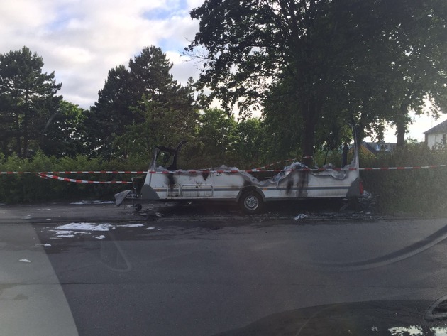 Komplett ausgebrannt ist ein Wohnwagen am frühen Sonntagmorgen auf dem Parkplatz der Schwimmhalle am Elsterweg. Die Einsatzzentrale der Feuer- und Rettungswache der Kupferstadt Stolberg wurde gegen 2.46 Uhr über einen brennenden Wohnwagen auf dem Parkplatz der Schwimmhalle über Notruf informiert. Sofort rückte der Löschzug der Feuerwache unter Leitung von Brandoberinspektor Udo Hermanns zum nahe gelegenen Parkplatz aus. Beim Eintreffen der Einsatzkräfte brannte der Wohnwagen bereits in voller Ausdehnung. Glücklicherweise war der Wohnwagen auf einer Freifläche abgestellt, so dass durch das starke Feuer keine anderen Gebäude oder Fahrzeuge beschädigt wurden. Die zum Wohnwagen gehörende Gasflasche, die eine enorme Gefahr für die Einsatzkräfte bei der starken Wärmebeaufschlagung darstellt, blieb unversehrt. Noch während der Löscharbeiten konnten die Beamten feststellen, dass sich keine Personen im Wohnwagen befanden und niemand verletzt wurde. Nach einer knappen Stunde war das Feuer mit einem C-Rohr und einem Schaumrohr gelöscht.