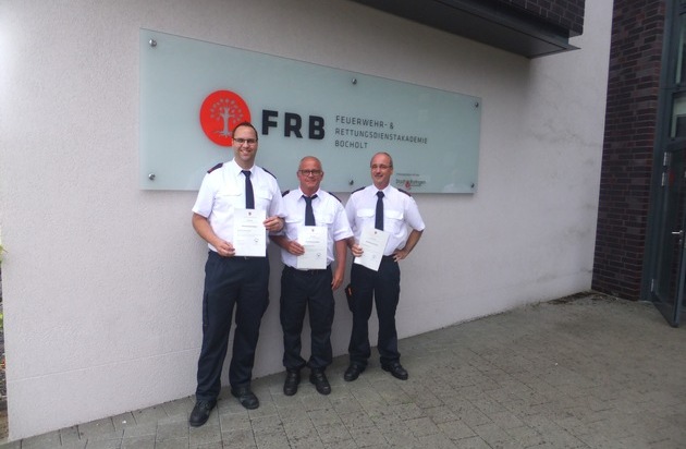 Nach einem 80-stündigen Aufbaulehrgang konnten die Stolberger Feuerwehrmänner Hauptbrandmeister Dieter Albrecht, Oberbrandmeister Michael Bartz und Oberbrandmeister Norbert Janssen erfolgreich die Ergänzungsprüfung zum Notfallsanitäter an der Feuerwehr- und Rettungsdienstakademie in Bocholt ablegen.
