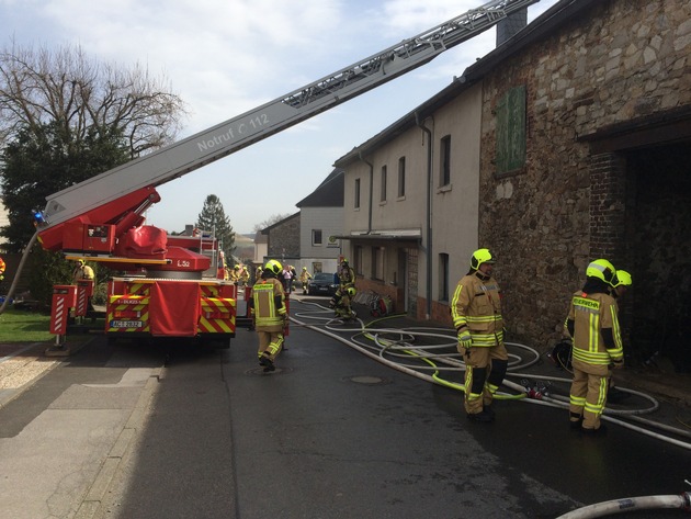 Eine große und weit sichtbare Rauchwolke stand am Sonntagmittag über Werth. In einem Wohnhaus mit angebauter Scheune in der Dorfstraße war ein Feuer ausgebrochen, das bereits auf das Dachgeschoss übergegriffen hatte. Zahlreiche Notrufe gingen kurz vor 12 Uhr in der Einsatzzentrale der Feuer- und Rettungswache ein. Gemeldet wurde eine brennende Scheune, die an einem Haus angebaut sei, mit einer sehr starken Rauchentwicklung. Daraufhin eröffnete der Disponent unter dem Einsatzstichwort "Bauernhof" den Einsatz und alarmierte den Löschzug der Feuerwache, den 4. und 5. Löschzug mit den Löschgruppen Gressenich, Werth, Mausbach, Vicht und Zweifall sowie Rettungswagen und Notarzt. Nach wenigen Minuten trafen bereits die ersten Einsatzkräfte vor Ort ein und fanden folgende Lage vor: Vollbrand eines Anbaus an der Rückseite des Gebäudes, der schon soweit auf das Dachgeschoss des Wohnhauses übergegriffen hatte, dass die Flammen bereits durch die durchgebrannte Dachhaut schlugen. Anwohner teilten mit, dass sich noch ein Hund im Gebäude befinden sollte. Sofort wurden parallel ein Löschangriff von außen von der Rückseite des Gebäudes vorgetragen, zwei weitere Trupps drangen durch den Eingangsbereich in das Erd- und Dachgeschoss zur Rettung des Hundes und zur Brandbekämpfung vor. Insgesamt wurden drei Strahlrohe im Innen- und zwei im Außenangriff vorgenommen. Zuerst konnten die Feuerwehrkräfte zwei Kaninchen aus dem Erdgeschoss retten und kurze Zeit später den Hund. Alle drei Tiere wurden mit Sauerstoff behandelt. Da der Hund augenscheinlich dem Rauch stärker ausgesetzt war, wurde er in eine Tierklinik gebracht. Von der Drehleiter aus wurde ein weiteres Strahlrohr zur Bekämpfung der Flammen eingesetzt und die Dachhaut geöffnet. Aufgrund des umfangreichen, aber sehr dosiert vorgetragenen Löschangriffes, konnte eine weitere Brandausbreitung schnell verhindert und das Feuer schnell gelöscht werden. Menschen wurden nicht verletzt. Polizei und Kriminalpolizei waren ebenfalls vor Ort. Auch Kreisbrandmeister Bernd Hollands machte sich vor Ort ein Bild über die Löscharbeiten. Insgesamt befanden sich rund 75 Kräfte unter Leitung von Amtsleiter Andreas Dovern im Einsatz. Nach rund zwei Stunden Einsatzdauer konnte "Feuer aus" gemeldet werden. Zur Sicherheit stellte die Löschgruppe Werth noch eine Brandwache bis gegen 17 Uhr.