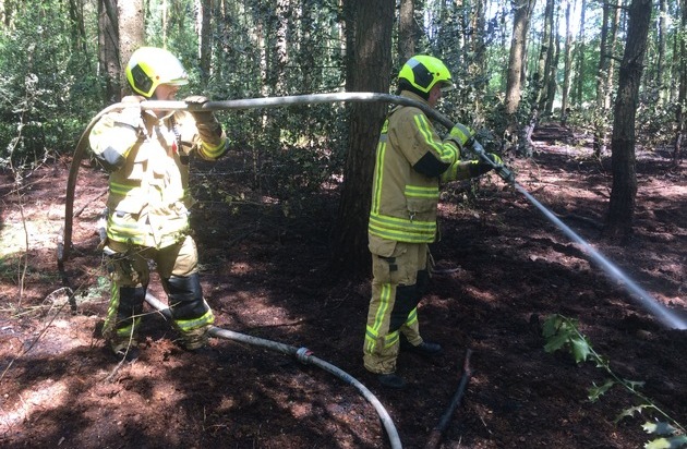 Dank eines umsichtigen Spaziergängers konnte am frühen Dienstagmittag ein größerer Flächen-/Waldbrand verhindert werden. Gegen 11.10 Uhr meldete der Spaziergänger einen Flächenbrand im Waldbereich zwischen Friedensstraße und Wasserturm. Da aufgrund der anhaltenden Trockenheit die Gefahr einer großen Brandausbreitung besteht, wurden sofort der Löschzug der Feuer- und Rettungswache sowie die Löschgruppe Mausbach alarmiert. Als die ersten Einsatzkräfte eintrafen, brannte es auf einer Fläche von gut 50 Quadratmeter. Zur Brandbekämpfung wurden Feuerpatschen und ein C-Rohr vorgenommen. Plötzlich auftretende Windböen verschärfte die Lage. In Sekunden breitete sich das Feuer großräumig auf rund 500 Quadratmeter aus. Um die Gefahr einer weiteren Ausbreitung zu verhindern und eine entsprechende Brandbekämpfung vornehmen zu können, wurde die Alarmstufe erhöht und die Löschgruppen Vicht, Zweifall, Breinig, Dorff, Venwegen und Gressenich nachgefordert. Mit rund 50 Feuerwehrleuten waren die Flammen schnell unter Kontrolle. Nachdem das Feuer endgültig gelöscht war, wurden ausgiebige Nachlöscharbeiten durchgeführt. Dabei wurden die Glutnester und der Waldboden mit viel Wasser durchtränkt. Die große Wärme machte auch den Einsatzkräften zu schaffen. So wurden die Nachlösch- und Aufräumarbeiten unter sogenannter "Marscherleichterung" durchgeführt.