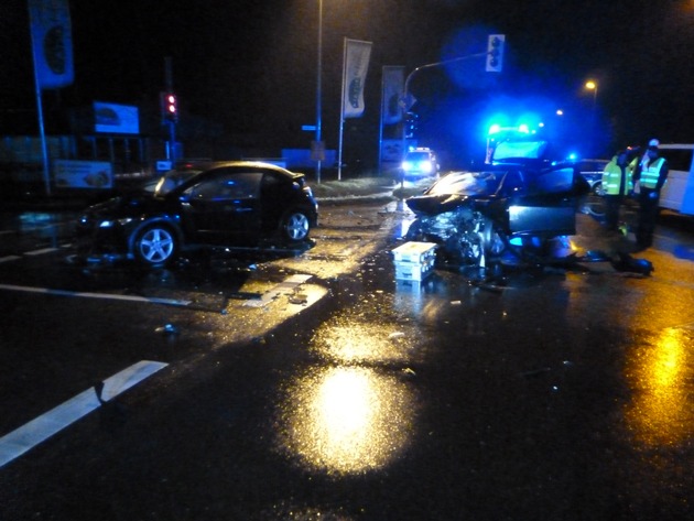 Um 23:24 Uhr wurden die Feuerwehr und der Rettungsdienst zu einem schweren Verkehrsunfall auf der Weseler Str. in Dinslaken alarmiert. Vor Ort fanden die Einsatzkräfte zwei schwer beschädigte Fahrzeuge auf der Kreuzung vor. Hierbei wurden zwei Personen verletzt. Die erste Meldung, dass eine Person noch im Fahrzeug eingeklemmt ist, hat sich vor Ort nicht bestätigt. Die verletzten Personen wurden an der Einsatzstelle notärztlich versorgt und zur weiteren Behandlung in die Dinslakener Krankenhäuser transportiert. Die Feuerwehr hat die beteiligten Fahrzeuge gesichert und die Batterien vorsorglich abgeklemmt. Die Weseler Str. musste im Kreuzungsbereich komplett gesperrt werden, gegen 00:05 Uhr war der Einsatz seitens der Feuerwehr beendet.