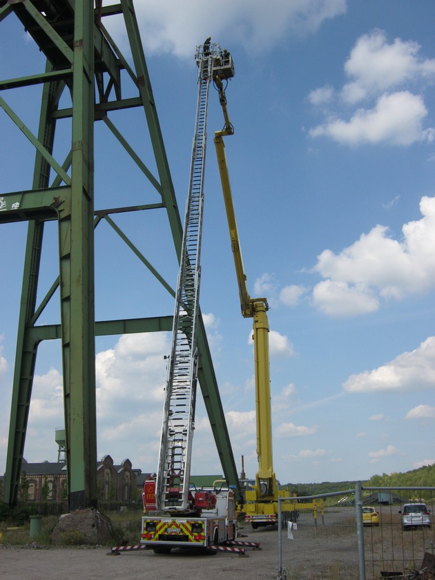 Heute um 14:50 Uhr wurde die Feuerwehr Dinslaken zu einer Personenrettung am ehemaligen Förderturm der Schachtanlage Lohberg gerufen. Bei Arbeiten am Förderturm kam es zu einem techn. Defekt an einer LKW-Teleskop-Arbeitsbühne. Auf ca. 30m Höhe blieb der Arbeitskorb plötzlich stehen. Ein gerufener Mechaniker konnte das Arbeitsgerät aber nicht instand setzen. Mit Hilfe der Drehleiter wurden drei Personen einzeln aus ca. 30m Höhe gerettet. Nach einer Stunde war der Einsatz beendet. Eingesetzt war die Einheit Hauptwache.