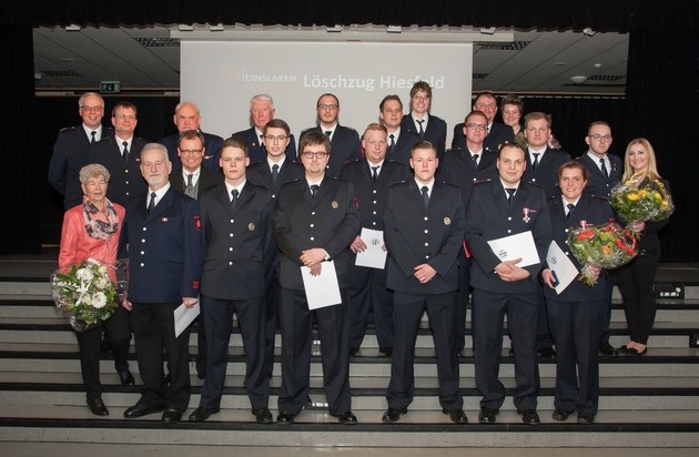 Am Samstag, den 20. Januar veranstaltete der Löschzug Hiesfeld sein Jahresfest 2018 mit dem traditionellem Karbonadenessen in der Aula des Gustav-Heinemann-Schulzentrums. Unter den ca. 200 Gästen befanden sich zahlreiche Förderer des ehrenamtlichen Engagements der Hiesfelder Wehr sowie Mitglieder der Verwaltung und der politischen Parteien. Insbesondere konnte Löschzugführer Ulrich Borgmann den Bürgermeister der Stadt Dinslaken, Dr. Michael Heidiger sowie den Leiter der Feuerwehr Dinslaken, Udo Walbrodt, willkommen heißen. Der Bürgermeister würdigte in seiner Rede die Leistungen der Wehr und betonte die Bedeutung des ehrenamtlichen Feuerwehrdienstes für das Allgemeinwohl der Bürger. Von den 72 Einsätzen des Löschzuges Hiesfeld wurden zwei Einsätze besonders erwähnt. In einem Gewerbebetrieb in Hiesfeld kam es am 15.09.2017 zu einem Brandereignis. Dieser Einsatz konnte erst nach 10 Std. beendet werden. Am 09. November rückten wir zur Otto - Brenner - Str. aus. Dort war es zu einem Verkehrsunfall mit 4 eingeklemmten Personen gekommen. Dieser anspruchsvolle Einsatz war nach 3 Std. beendet. Daneben fanden die ehrenamtlichen Helfer im letzten Jahr auch noch Zeit, an mehreren Hiesfelder Schulen Brandschutzerziehungen durchzuführen. 5 Mal wurden Martinszüge der Hiesfelder Schulen und der Werbegemeinschaft Hiesfeld begleitet. Des Weiteren wurden mehr als 1000 Stunden von den Frauen und Männern der Hiesfelder Feuerwehr in die Aus- und Fortbildung investiert. Für die geleistetet Arbeit sprach er der Wehr seinen persönlichen, sowie den Dank von Rat und Verwaltung aus. Im Rahmen der Veranstaltung wurden folgende Ehrungen und Beförderungen ausgesprochen: