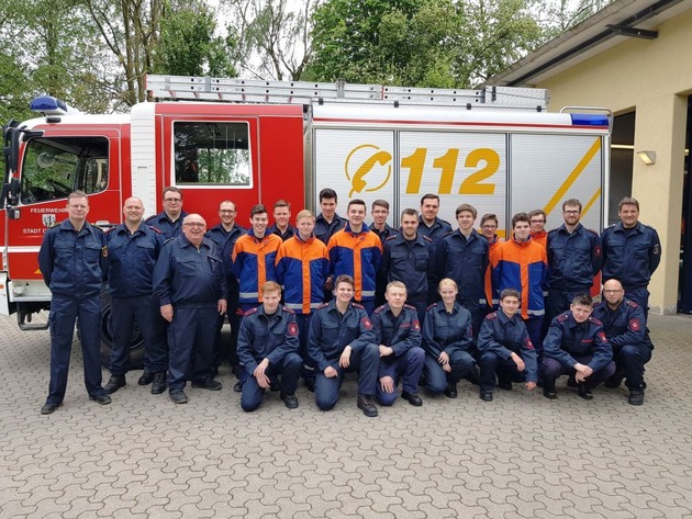 Heute wurde im Beisein des Leiters der Feuerwehr Dinslaken Udo Walbrodt und dem Stellvertreter Peter Lindemans die Abschlussprüfung des Modul 2 abgenommen. Die Ausbilder David Hinsenkamp, Stefan Rüdiger und Andreas Jühlke wurden dabei von Markus Schröter, Karl Segerath, Tim Hoferichter, Christian Maas und Patrick Stepper aus den Löschzügen unterstützt. Das viele Üben und Lernen hat sich ausgezahlt, alle Teilnehmer haben das Modul 2 erfolgreich abgeschlossen. Für Simon Boscheinen, Martin Brandt, Celine de Lasberg, Kevin Florenski, Maurice Große Homann, Tilman Härter, Matthias Hussing, Marcel Jungemann, Cihan Kühn, Malte Kupper, Alexander Kurz, Jan Frederik Lang, Tobias Loosemann, Carlo Marrone, Lucas Mehr, Dominik Reuter, Eric Spelleken, Luca Unterbrink, Justin Wälscher, Enrico Wanderscheck, Christian Wendt, Gianluca Westerfeld, startet dann im September das dritte Modul der Grundausbildung.