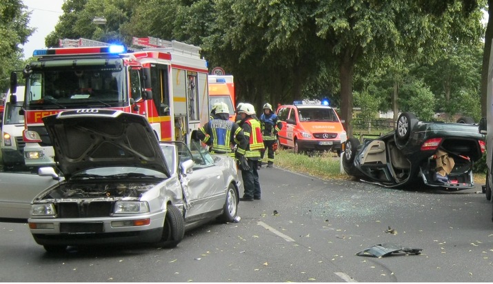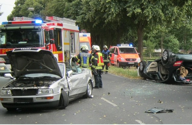 Am Freitagnachmittag gegen 16:00 Uhr wurde die Feuerwehr Dinslaken zu einem Verkehrsunfall auf der Hünxer Str. alarmiert. Im Kreuzungsbereich Schwarzer Weg kollidierten zwei Fahrzeuge miteinander. Beim Eintreffen der Rettungskräfte lag einer der zwei Fahrzeuge auf dem Dach. Die Fahrzeuginsassen hatten zu diesem Zeitpunkt bereits ihre Fahrzeuge verlassen. Aufgrund dessen konnte eine schnelle Versorgung der Patienten durch den Rettungsdienste eingeleitet werden. Die Feuerwehr stellte den Brandschutz sicher und klemmte die Fahrzeugbatterien ab. Beide Fahrzeuginsassen wurden zur weiteren Behandlung in ortsansässige Krankenhäuser gefahren. Zur Unfallaufnahme wurde die Polizei durch die Feuerwehr unterstützt. Im Einsatz waren Einsatzkräfte der Einheiten Stadtmitte und dem Hauptamt, sowie der Rettungsdienst der Feuerwehr Dinslaken und der Johanniter Unfallhilfe.