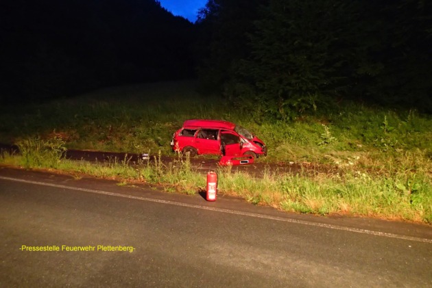 Am Freitagabend gegen 22:00 Uhr wurden die hauptberuflichen Kräfte der Feuer- und Rettungswache, sowie die beiden feuerwehreigenen Rettungswagen und ein Rettungswagen aus Finnentrop zu einem Verkehrsunfall auf der K5 zwischen Heveschotten und Hachmecke alarmiert. Ein mit zwei Kindern und zwei Erwachsenen besetztes Fahrzeug war von Landemert in Richtung Plettenberg unterwegs, überschlug sich und kam völlig zerstört auf einem Parkplatz zum Stehen. Offensichtlich leichtverletzt konnten alle vier Insassen das Fahrzeug selbstständig verlassen. Nach rettungsdienstlicher Versorgung wurden die Kinder in die Kinderklinik nach Lüdenscheid, sowie die beiden Erwachsenen ins Plettenberger Krankenhaus zur genaueren Abklärung der Verletzungen verbracht. Die Feuerwehr unterstützte bei der Versorgung der Verletzten, sicherte den Brandschutz und leuchtete die Einsatzstelle während der Unfallaufnahme durch die Polizei aus. Für gut eine Stunde war die K5 während der Rettungs- und Bergungsarbeiten voll gesperrt.