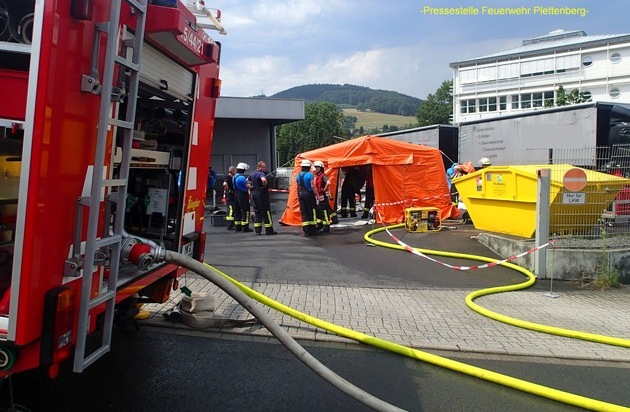 FW-PL: Gefahrstoffaustritt in Plettenberger Industriebetrieb. Feuerwehr mehrere Stunden mit Eindämmung des Schadens beschäftigt