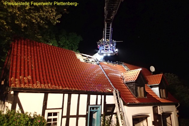 Auf Grund eines Unwetters, welches am frühen Morgen gegen 01:00 Uhr über Plettenberg hinweg zog, schlug ein Blitz in ein denkmalgeschütztes Nebengebäude des Forsthaus Soen ein. Dabei geriet der Dachstuhl des Doppelwohnhauses in Brand. Durch den lauten Knall aufgeschreckt, konnten die beiden Bewohner der Haushälften ihre Wohnungen rechtzeitig verlassen und die Feuerwehrleitstelle über den Notruf 112 alarmieren. Zu diesem Zeitpunkt war das Dachgeschoss bereits stark verqualmt und Flammen schlugen aus dem Dachstuhl. Um 01:13 Uhr wurden die hauptberuflichen Kräfte der Feuer- und Rettungswache, sowie die ehrenamtlichen Kräfte vom Löschzug 3, bestehend aus den Löschgruppen Eiringhausen, Ohle und Selscheid mit dem Stichwort "Gebäudebrand" alarmiert. Bei Eintreffen der hauptberuflichen Kräfte am etwas abseits gelegenen Anwesen standen die Bewohner bereits vor dem Haus und unternahmen über eine angestellte Leiter eigene Löschversuche mit einem Gartenschlauch. Im beengten Innenhof wurde umgehend die Drehleiter in Stellung gebracht, währenddessen ein Trupp unter schwerem Atemschutz einen Innenangriff mittels Löschrohr im stark verrauchten Dachgeschoss vornahm. Die nachrückenden Kräfte konnten auf der einspurigen und sehr beengten Zufahrt teilweise nur hintereinander ihre Fahrzeuge in Stellung bringen. Mit insgesamt zwei C- Rohren im Innen- und Aussenangriff konnte der Brand schnell unter Kontrolle gebracht werden. Die Löschwasserversorgung wurde aus den mitgeführten Löschwassertanks der Löschfahrzeuge, sowie aus einem Unterflurhydranten sichergestellt. Aufwändig gestalteten sich die Nachlöscharbeiten, denn der Brand war in die Deckenverkleidung gezogen, welche durch mehrere Trupps unter schwerem Atemschutz von Innen freigelegt werden musste. Hierbei kam auch eine Wärmebildkamera zum Einsatz um die Glutnester aufzuspüren. Erst nach gut zwei Stunden konnten die knapp 45 Einsatzkräfte der Feuerwehr wieder in ihre Standorte einrücken. Zur Schadenshöhe kann die Feuerwehr keine Auskunft geben, es wurden aber beide ausgebauten Dachgeschosse des Doppelwohnhauses durch den Brand stark in Mitleidenschaft gezogen.