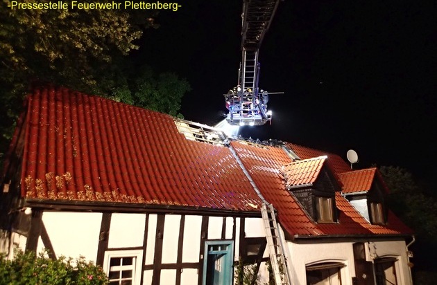 FW-PL: Dachstuhlbrand in denkmalgeschütztem Gebäude nach Blitzeinschlag im OT Plettenberg-Soen. Bewohner konnten sich rechtzeitig in Sicherheit bringen. Feuerwehrangehörigem wurde Auto aufgebrochen