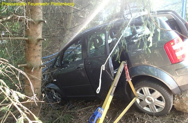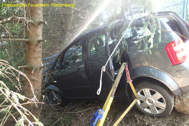 "Verkehrsunfall unklare Lage auf der Ebbetalstraße in Höhe über der Haardtwiese", so lautete am heutigen Montag gegen 13:00 Uhr die Meldung der Feuerwehrleitstelle aus Lüdenscheid für die hauptberuflichen Kräfte der Feuer- und Rettungswache. Bei Eintreffen der Einsatzkräfte stand ein Audi A2 abschüssig in einem Hang zwischen mehreren Bäumen und war dort offensichtlich nach einer Frontalkollision mit einem Baum zum Stehen gekommen. Zuvor hatte das Fahrzeug auf etwa 10 Meter Länge einen Metallgitterzaun durchbrochen. Die Fahrerin saß ansprechbar im Fahrzeug und wurde von Ersthelfern betreut. Noch vor Eintreffen der Feuerwehr hatten weitere Helfer das Fahrzeug notdürftig mit einem Spanngurt eines Fahrschulanhängers an einem Baum gegen Abrutschen gesichert. Zunächst einmal musste die Feuerwehr das Fahrzeug gegen weiteres Abrutschen sichern, denn es stand völlig instabil zwischen den Bäumen. Dieses gelang der Feuerwehr mit einem speziellen Stabilisierungssystem und dem Einsatz der Seilwinde des Hilfeleistungslöschfahrzeuges. Erst danach konnte die Frau noch im Fahrzeug notärztlich versorgt werden. Im Anschluss wurde die Frau von der Feuerwehr aus der steilen Uferböschung gerettet und zur weiteren Behandlung in den Rettungswagen gebracht. Mit Hilfe der Seilwinde gelang es der Feuerwehr das Fahrzeug aus der Böschung wieder auf die Straße zu ziehen, wo es später durch ein Abschleppunternehmen geborgen wurde. Die Fahrerin des PKW wurde mit Verdacht auf schwere Verletzungen dem Klinikum Lüdenscheid zugeführt. Zur genauen Unfallursache kann die Feuerwehr keine Auskunft geben. Fakt ist aber, dass der PKW aus Himmelmert in Fahrtrichtung Lettmecke unterwegs war und dort kurz nach dem ehemaligen "D-Zug" von der Fahrbahn abkam. In dem knapp einstündigen Einsatz waren insgesamt 10 Kräfte von Feuerwehr und Rettungsdienst eingebunden. Die Ebbetalstraße musste in der Zeit für die Rettungs- und Bergungsarbeiten voll gesperrt werden.